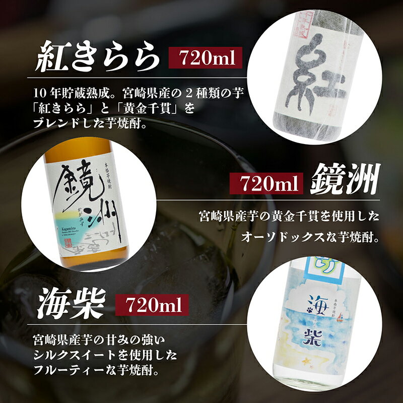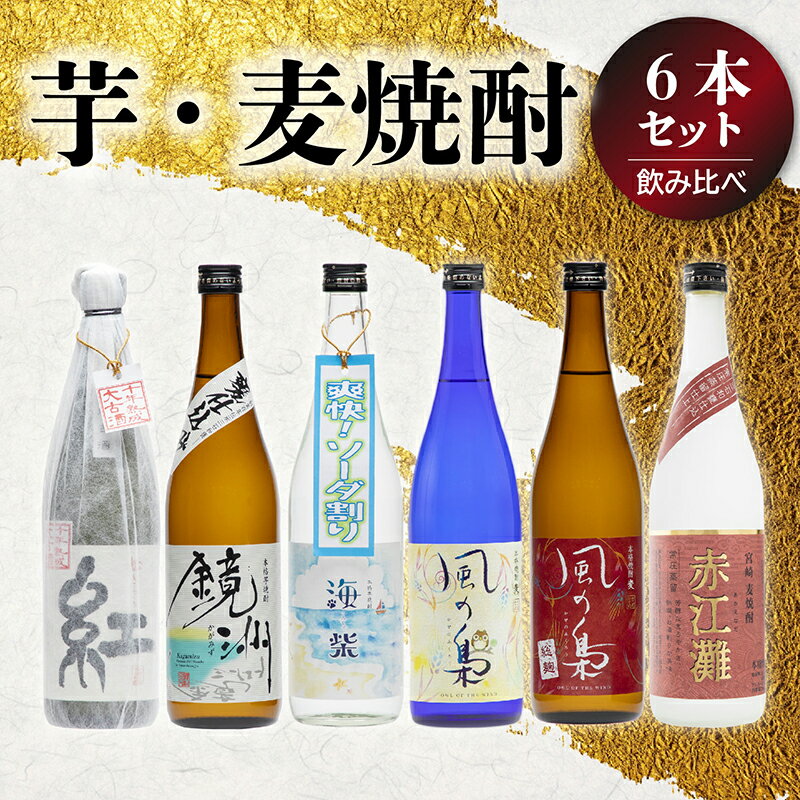 特産品説明 名称 【ふるさと納税】芋、麦焼酎飲み比べ6本セット 内容量 ・紅きらら : 芋焼酎25度 720ml×1本・鏡洲(かがみず) : 芋焼酎25度 720ml×1本・海柴(うみしば) : 芋焼酎20度 720ml×1本・風の梟(ふくろう) : 麦焼酎25度 720ml×1本・風の梟総麹(ふくろうそうこうじ) : 麦焼酎25度 720ml×1本・赤江灘(あかえなだ) : 麦焼酎25度 720ml×1本 原材料/成分 ・紅きらら : 芋焼酎25度 芋(宮崎県産)、米麹(国産米)・鏡洲(かがみず) : 芋焼酎25度 芋(宮崎県産)、米麹(国産米)・海柴(うみしば) : 芋焼酎20度 芋(宮崎県産)、米麹(国産米)・風の梟(ふくろう) : 麦焼酎25度 麦(国産麦)、麦麹(国産麦)・風の梟総麹(ふくろうそうこうじ) : 麦焼酎25度 麦麹(国産麦)・赤江灘(あかえなだ) : 麦焼酎25度 麦(国産麦)、麦麹(国産麦) 賞味期限 なし 配送温度帯 常温 説明 ・紅きらら 芋焼酎 720ml×1本10年貯蔵熟成。
