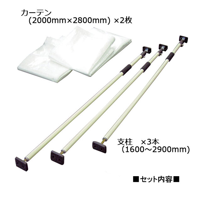 簡単施工の間仕切りカーテン 【再入荷しました!!】 人気急上昇商品! ■カーテン2枚 + 支柱3本のセット品です■ カーテン 幅:2000mm 長さ:2800mm 材質:ポリエチレン 色:白(半透明) 支柱 長さ:1600〜2900mm(調節可能) 材質:スチール メーカー:エムエフ ■特徴 床や天井を傷つけることなく、部屋や廊下の間仕切りに使用できます。