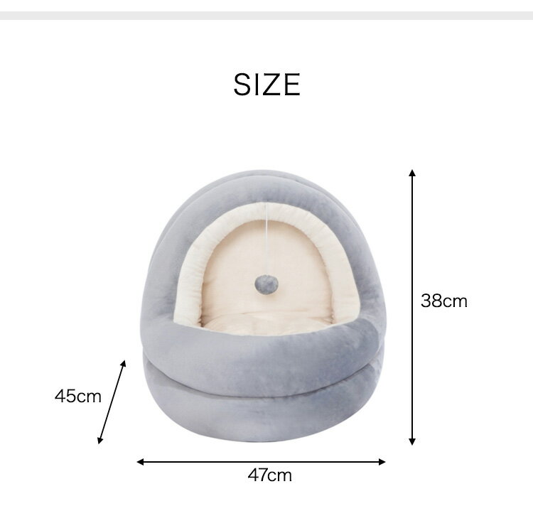 【サイズ】本体:45×47×38cmハウス入口:36×25cmクッション:40×40×7cm【素材】側地:ポリエステル100%中材:ポリエステル綿■特長・ふわふわとした触り心地とコロンとした丸いフォルムがかわいいドーム型ペットハウスです・ふんわりと身体を包めるので寒がりのペットにもおすすめです・しっかりとした厚みとボリュームたっぷりのクッションでペットの身体を支えます・くつろぎながらじゃれて遊べるおもちゃ付きです【特長】ペットハウス、ペットベッド、キャットハウス、ドッグハウス、ペットハウス、猫ベッド、犬ベッド、キャット、ドッグ、犬、猫、クッション、ペットクッション、インテリア、かわいい、おしゃれ、シンプル、モノトーン、フワフワ、モコモコ、安眠、快眠、プレゼント【送料について】北海道、沖縄、離島は別途送料を頂きます。