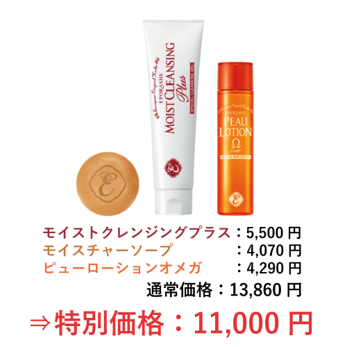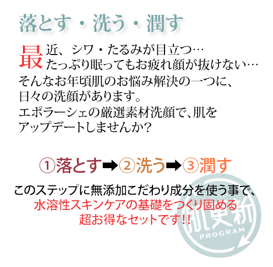 こだわりの基本セットと併用すれば、 洗顔~美白・保湿ケアまで超お得なライン使いが可能!! こだわりの基本セットはこちら エポラーシェの美容論はクレンジングから始まる! 水溶性のお手入れの基本中の基本、美容液のようなクレンジングと洗顔ソープ、そしてその次のステップである肌を潤すための化粧水をセットにしたお得なセットです。