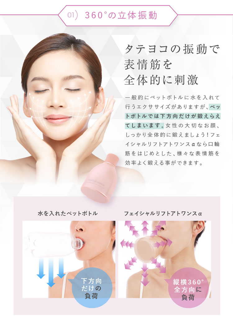 縦横2つのおもりを強弱4段階で360°前後左右に振り回まわすような遠心力を発生させてペットボトルダイエットでは鍛えられない表情筋や口輪筋を効率よく鍛えます。