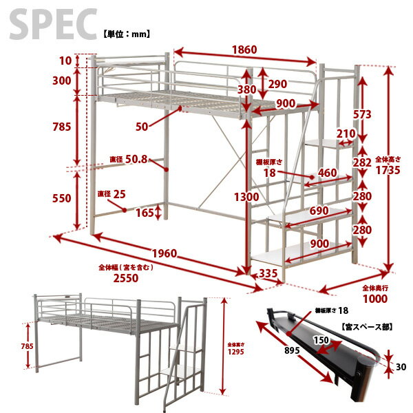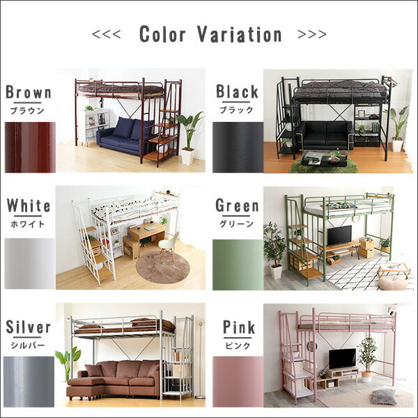 【商品について】階段付き ロフトベット ■サイズ:外寸:(約)ハイタイプ:幅255cmx奥行き100cmx高さ173.5cmミドルタイプ:(約)幅255cmx奥行き100cmx高さ129.5cm※商品重量:(約)83kg■カラー:ブラック 黒 ブラウン 茶色 シルバー ホワイト 白 ■素材:スチールパイプ ■その他:・お客様組立商品です・梱包サイズ:3梱包でのお届けとなります(1/3)(約)134x109x14.5cm (2/3)(約)107.5x107.5x14.5cm (3/3)(約)194x42x9cm・梱包重量:(約)85kg送料について配送について送料無料※沖縄・離島・一部地域を除く詳しくはお問い合わせ下さい。