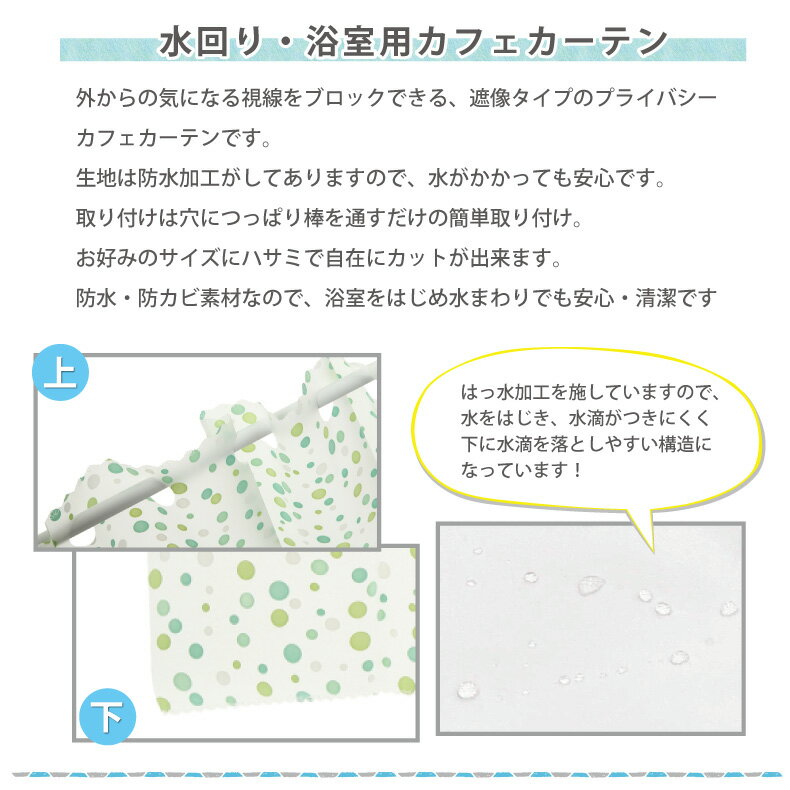 お風呂 カフェカーテン 140×80cm 遮像 はっ水 防カビ 『 ドロップ 』 (全3色) 浴室 脱衣所 プライバシー保護 [撥水 間仕切り 出窓 おしゃれな 目隠し 小窓 水玉柄 かわいい キッチン シャワー トイレ]