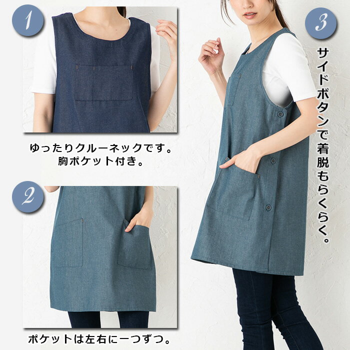 エプロン デニム かぶるだけ お尻が隠れる ナチュラル シンプル おしゃれ チュニック サイドボタン M-Lサイズ tb341 保育士 脇ボタン 紐なし ペン差し ポケットたくさん 多数 母の日 かわいい かぶり 無地 体型カバー 40 50 60 70代 シニア 敬老の日 背付き 袖なし割烹着