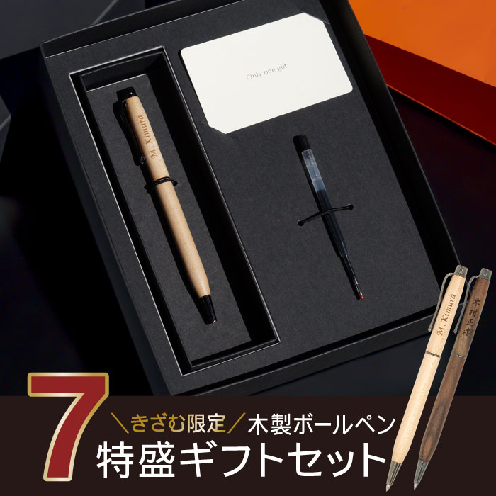 出荷日からお届けまでの目安はコチラ >> 商品情報 【木製スリムボールペン 7特盛 ギフト セット 】 きざむ限定!7特盛ギフトセット 木製スリムボールペン、替芯、プロモーションカードを豪華ボックスに 詰め込んで、さらにプレゼントを渡すときに便利なギフトバックと メッセージカードがセットになった、買い足し不要のボリュームギフト! 名入れのボールペンで世界にひとつの特別なギフトに。