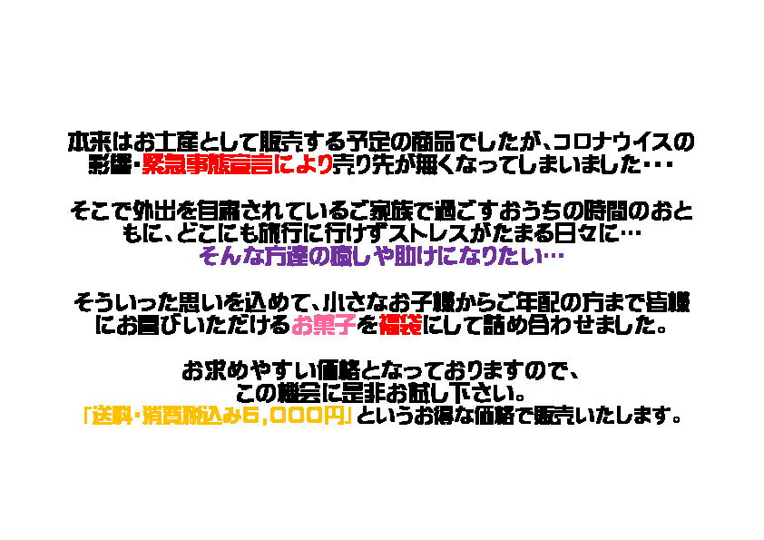 販売者株式会社タナベ岡山県津山市宮尾645【外出自粛キャンペーン第1弾】【数量限定】【送料無料】総額7,500円以上の商品を詰め合わせてお届け! 岡山県 グルメ 岡山 ギフト お菓子 お取り寄せ お土産 訳あり 詰め合せ 観光 土産 岡山土産 コロナ 数量限定 自粛 賞味期限 間近あり コロナ訳あり セール 箱不良 福袋 総額7,500円以上の商品を詰め合わせてお届け! 岡山県と広島県・一部神戸のお土産詰合わせ福袋5,000円 送料無料 期間限定・数量限定 訳アリ(賞味期限間近の商品有り) 福袋 【おうち時間お楽しみセット】総額7,500円以上の商品をお届けいたします! 本来はお土産として販売する予定の商品でしたが、コロナウイルスの影響で売り先が無くなってしまいました・・・そこで家族だんらんでお過ごしのご家族の方々、旅行に行くことができず日々ストレスを抱える方々・・・そんな方達にひと時のわくわく感を味わっていただけたらと思い企画いたしました。