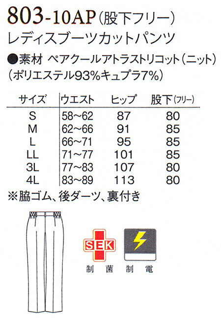 ●メーカー アプロンアパレル(apron) ●品番 803-10AP ●商品名 レディースブーツカットパンツ 股下フリー(未加工) ●カラー 10:ホワイト ●サイズ S〜4L ●素材 ペアクールアトラストリコット(ニット) ポリエステル93%・キュプラ7% ●仕様 脇ゴム、前後ダーツ、裏付き ※ご利用のモニターにより環境や光の加減によって若干色が異なる場合がございます。